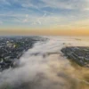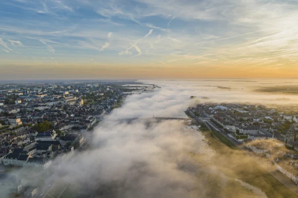 La vue se perd dans cette rencontre fantastique, qui a lieu entre la lumière qui se faufile juste et le ciel qui s’habille maintenant de bleu pâle et d’orange. Les contours des maisons apparaissent doucement dans la brume, les silhouettes étant le seul témoin matériel de l’éveil de la ville et de sa dérive onirique entre la réalité et le rêve.